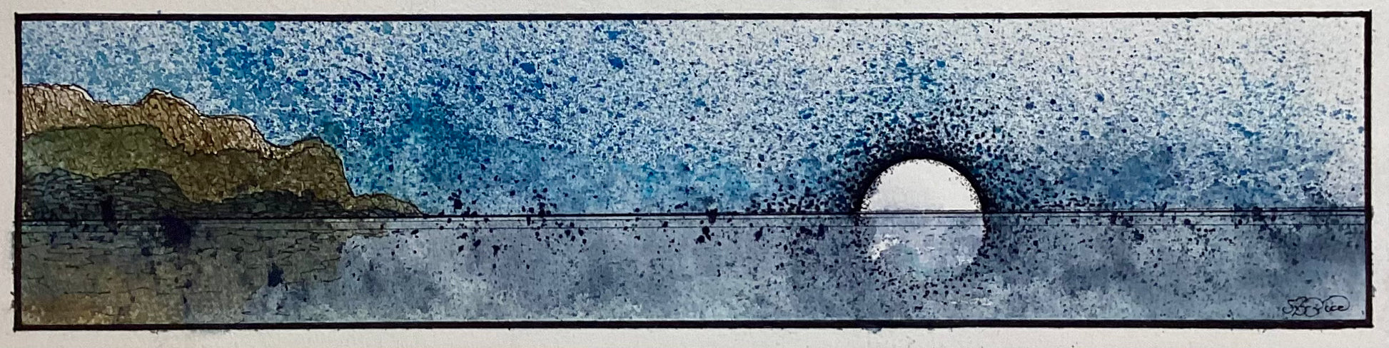 Obra abstracta en técnica mixta que representa un lago helado y la luna. Acuarela y tinta sobre papel. 25,5 cm x 6,5 cm (10” x 2,5”), enmarcada en madera negra de 8” x 13”.