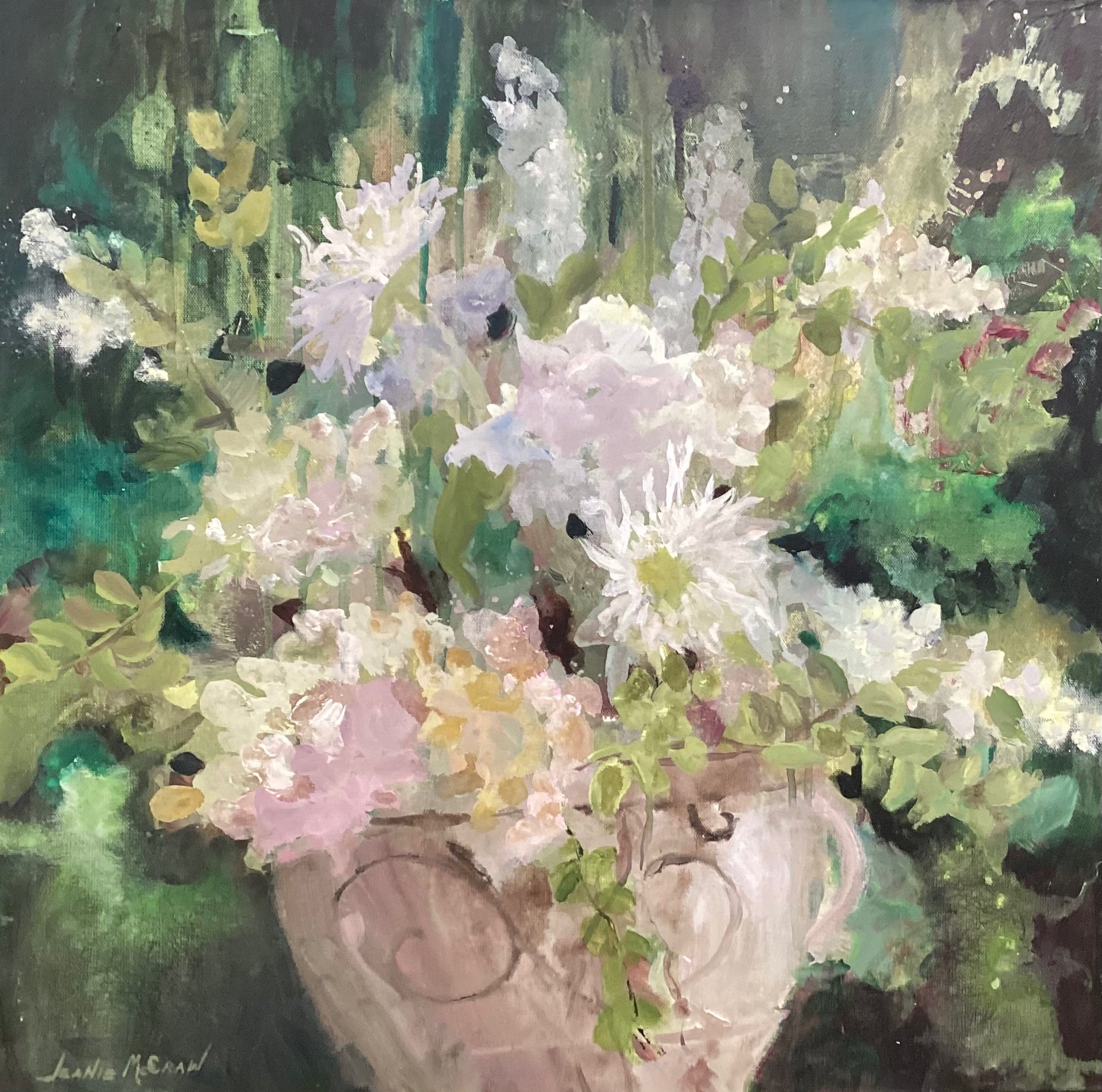 Obra original en acrílico, de estilo floral suelto, pintada sobre lienzo entelado en verde y blanco. Sin marco. 61 x 61 x 3,8 cm.