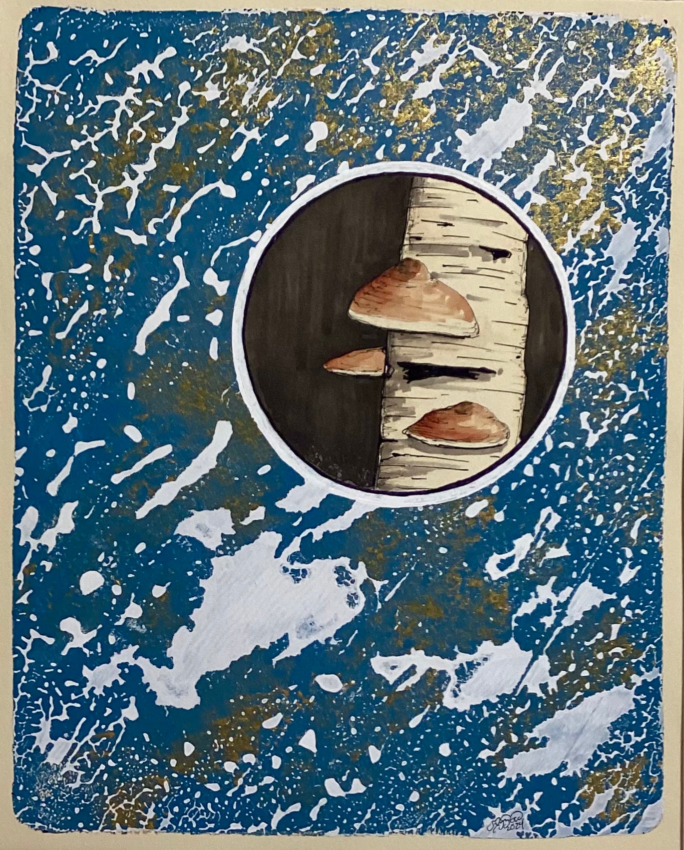 Técnica mixta abstracta que representa setas en un abedul rodeado de nieve sobre un fondo azul. Acrílico y tinta sobre papel. 20,5 cm x 25,5 cm (8” x 10”), enmarcado en un marco de madera negra de 35,5 cm x 45,7 cm (14” x 18”).