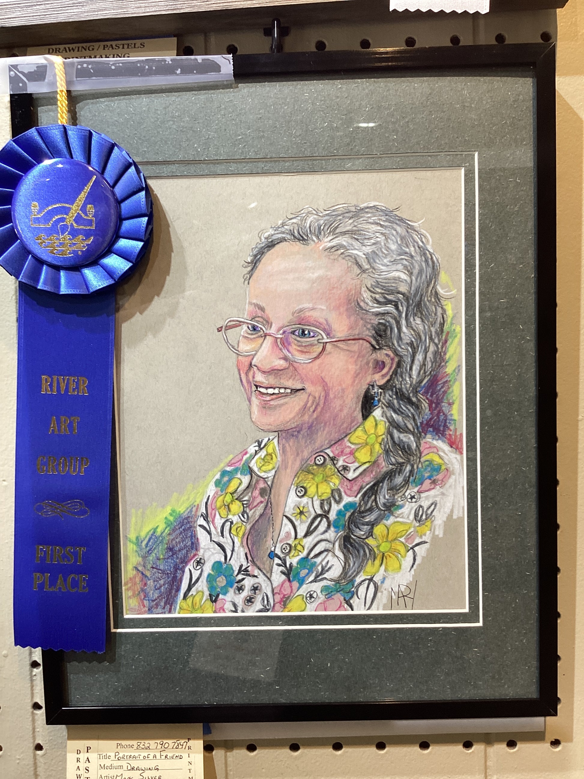 Este boceto de 20 x 25 cm (8 x 10 pulgadas) de la artista de San Antonio, Mary Silver, fue creado con lápices de colores. Está enmarcado y con paspartú en un marco de 28 x 35 cm (11 x 14 pulgadas). Ganó el primer lugar en dibujo en Artober 2025.