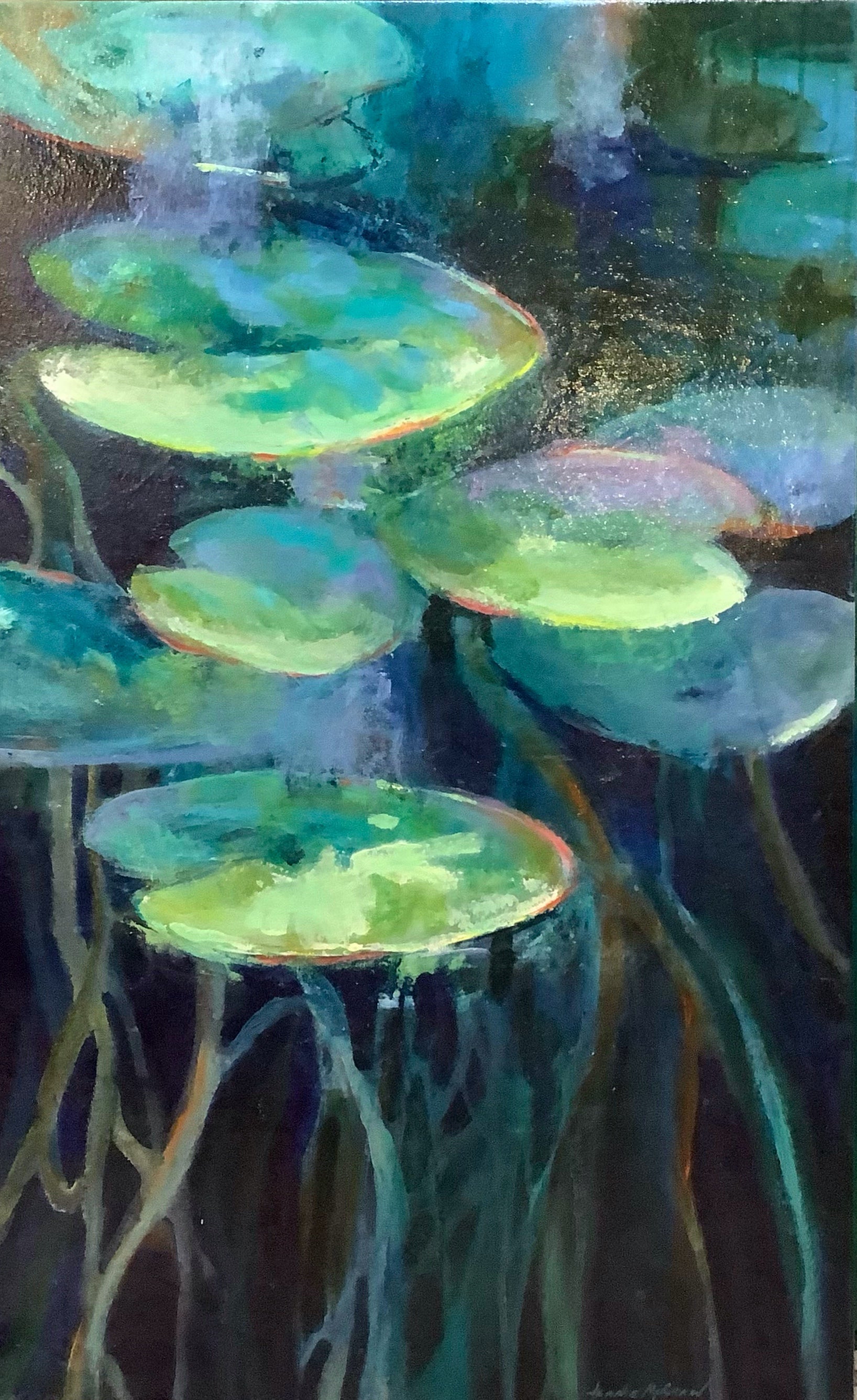 Pintura acrílica original de nenúfares en un colorido estilo contemporáneo sobre lienzo con bastidor. Sin marco. 61 x 102 x 4 cm. Colores: azul, verde, turquesa, naranja y amarillo.
