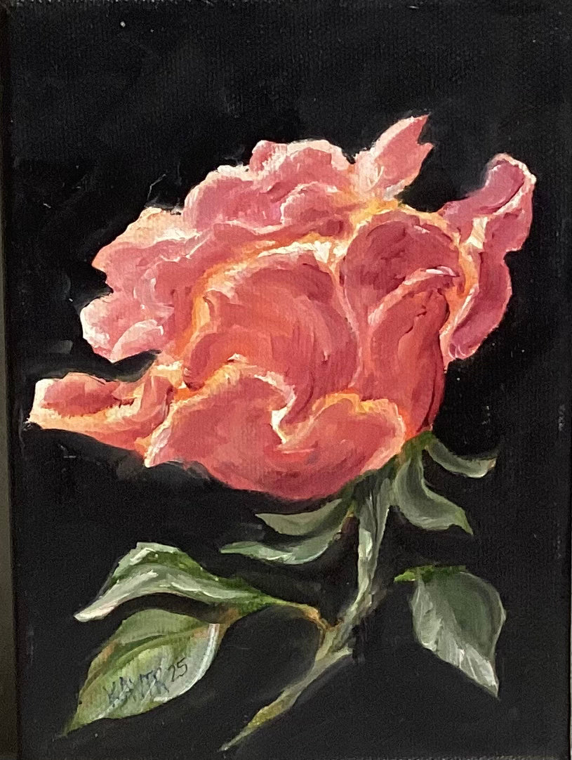 Rosa coral individual sobre fondo negro, lienzo estirado de 5 x 7 pulgadas