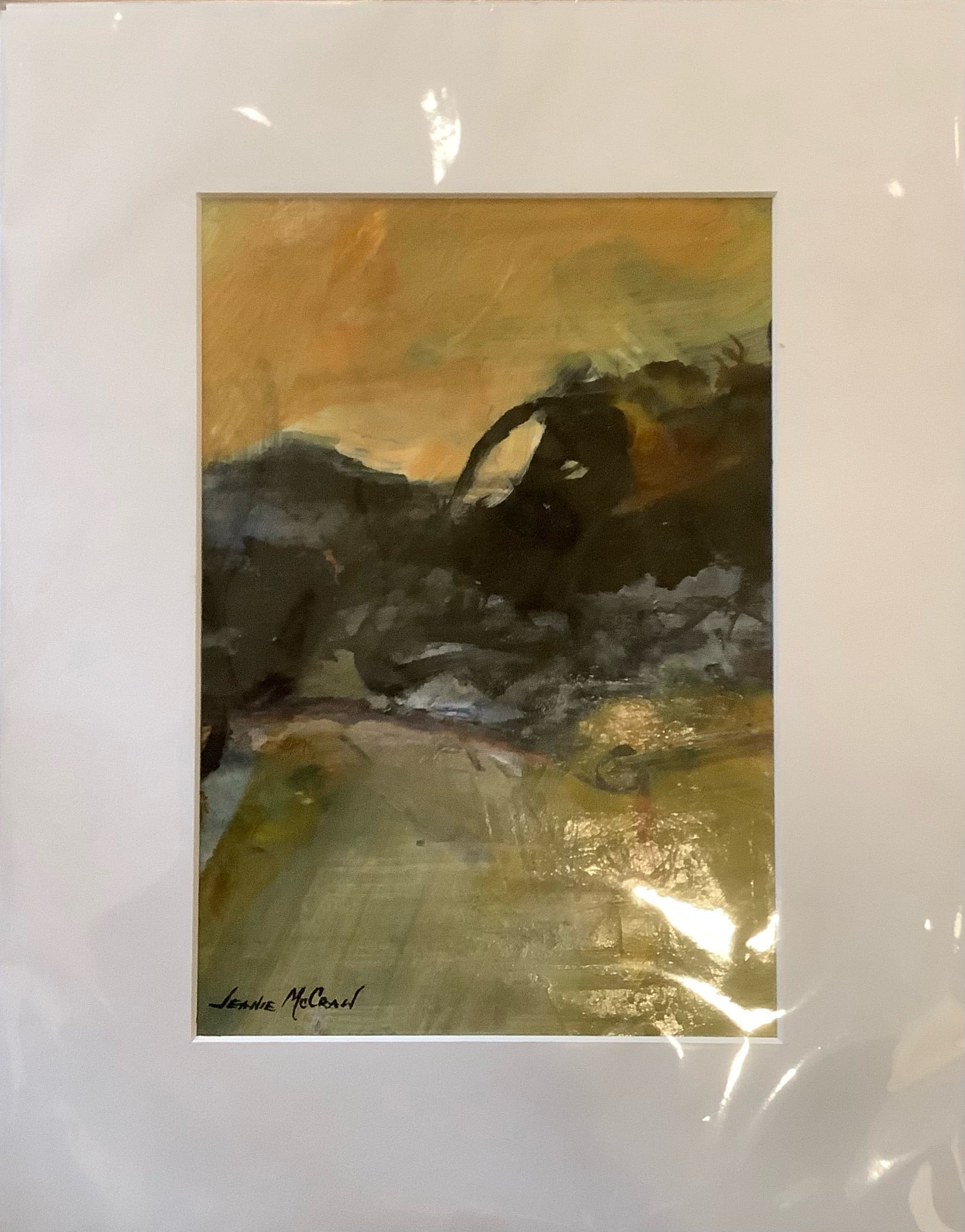 Original acrylic abstract painting on watercolor paper matted for use in a n 11" x 14" frame (not provided). Colors include black, brown, gold and green.