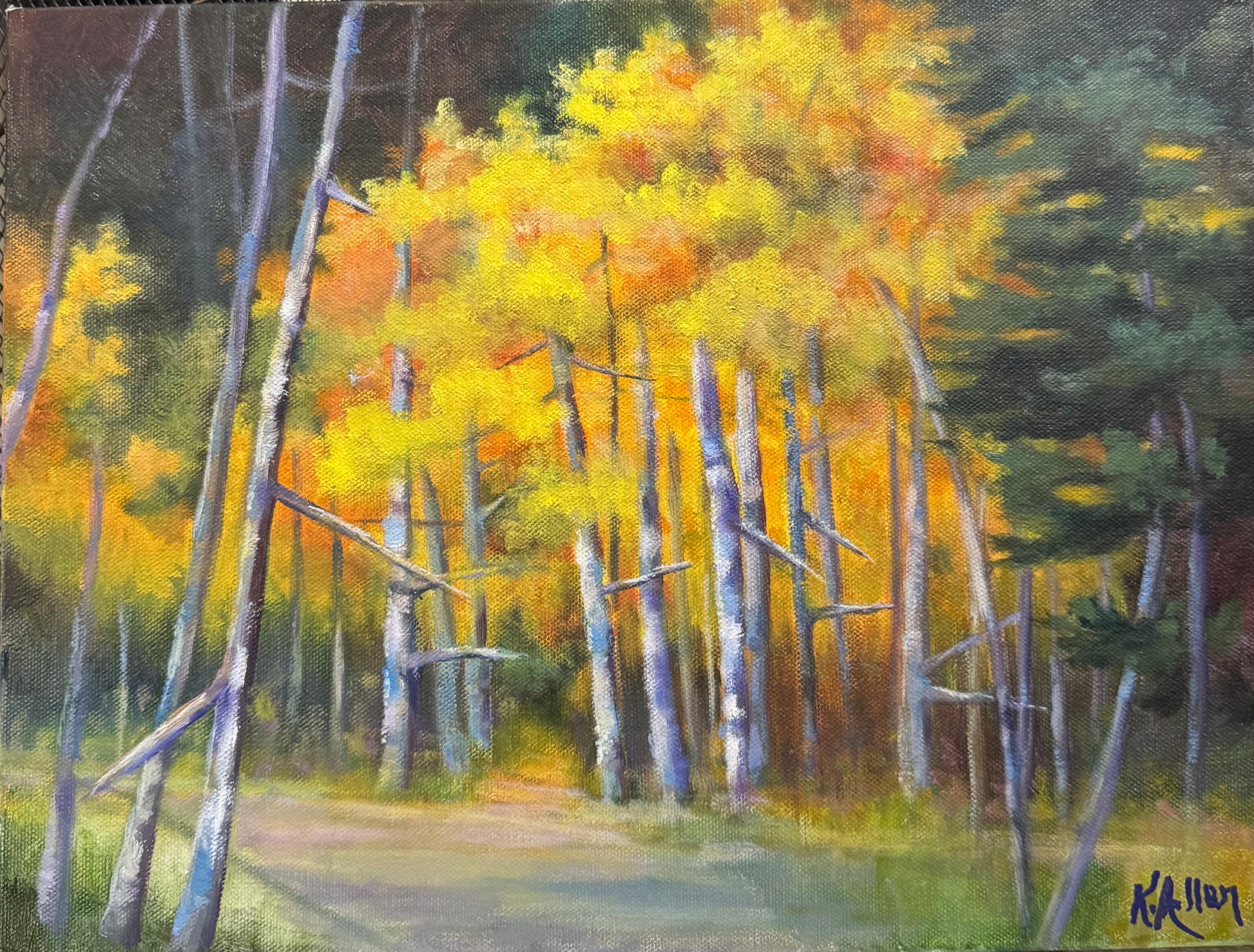 Fall morning stroll through the woods. Bright, vibrant colors. Original oil on 12 x 16 gallery wrap canvas so no need to frame.