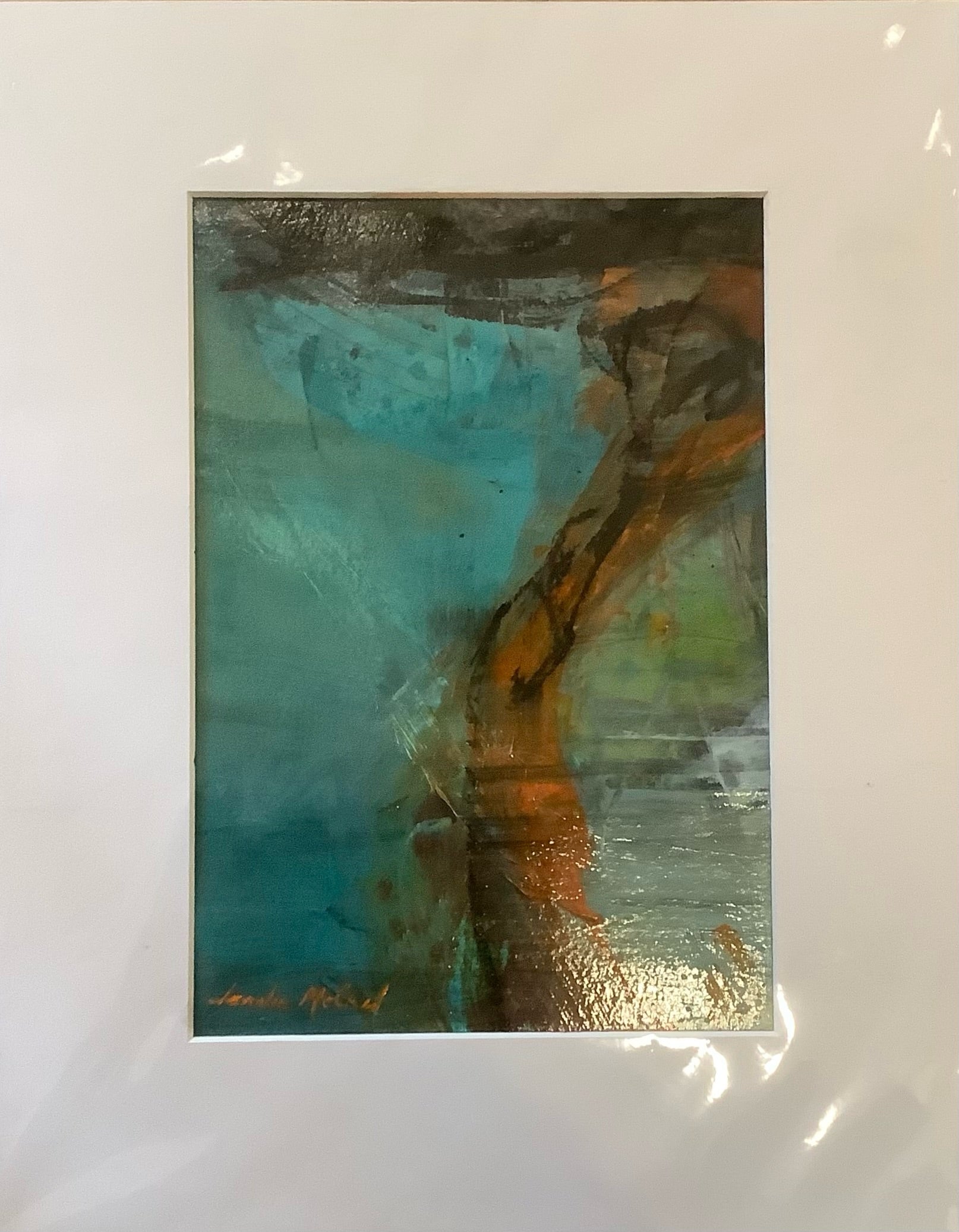 Original acrylic abstract painting on watercolor paper matted for an 11" x 14" frame (not included). Colors io include Teal, orange, black and green.