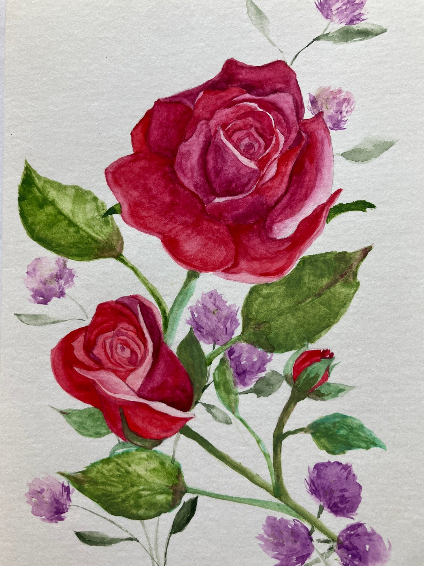 Original watercolor painting on a 5" x 7 " folding watercolor note card. It features an open red rose, one opening red rose and one red bud with purple clover wildflowers.