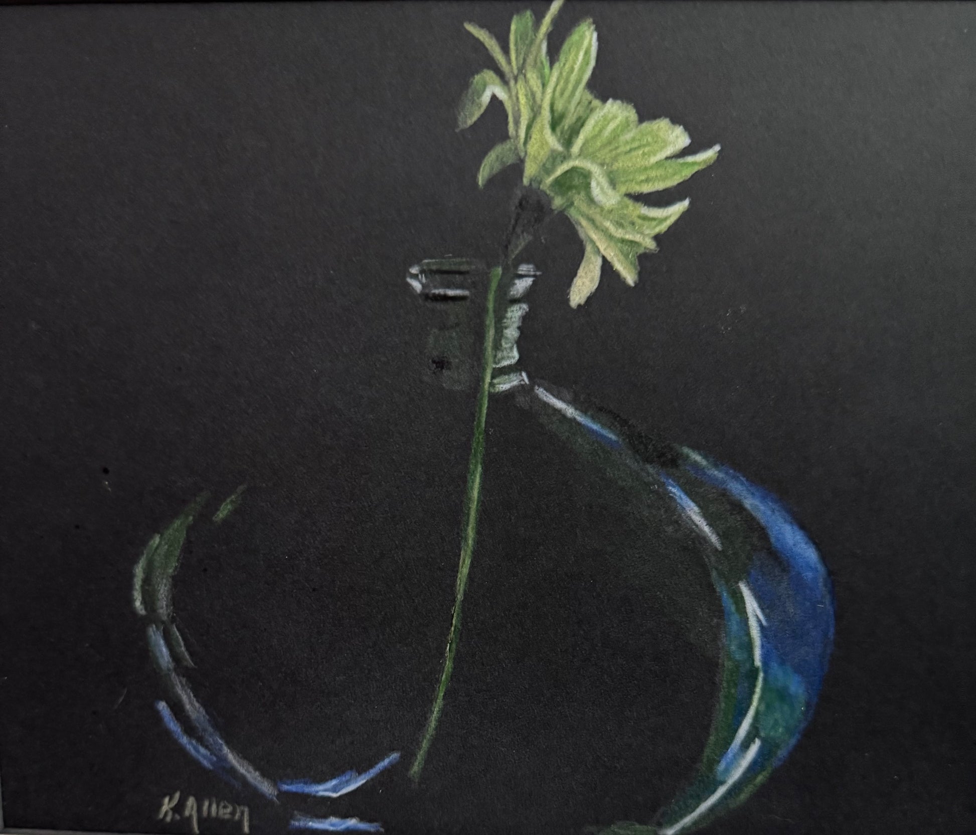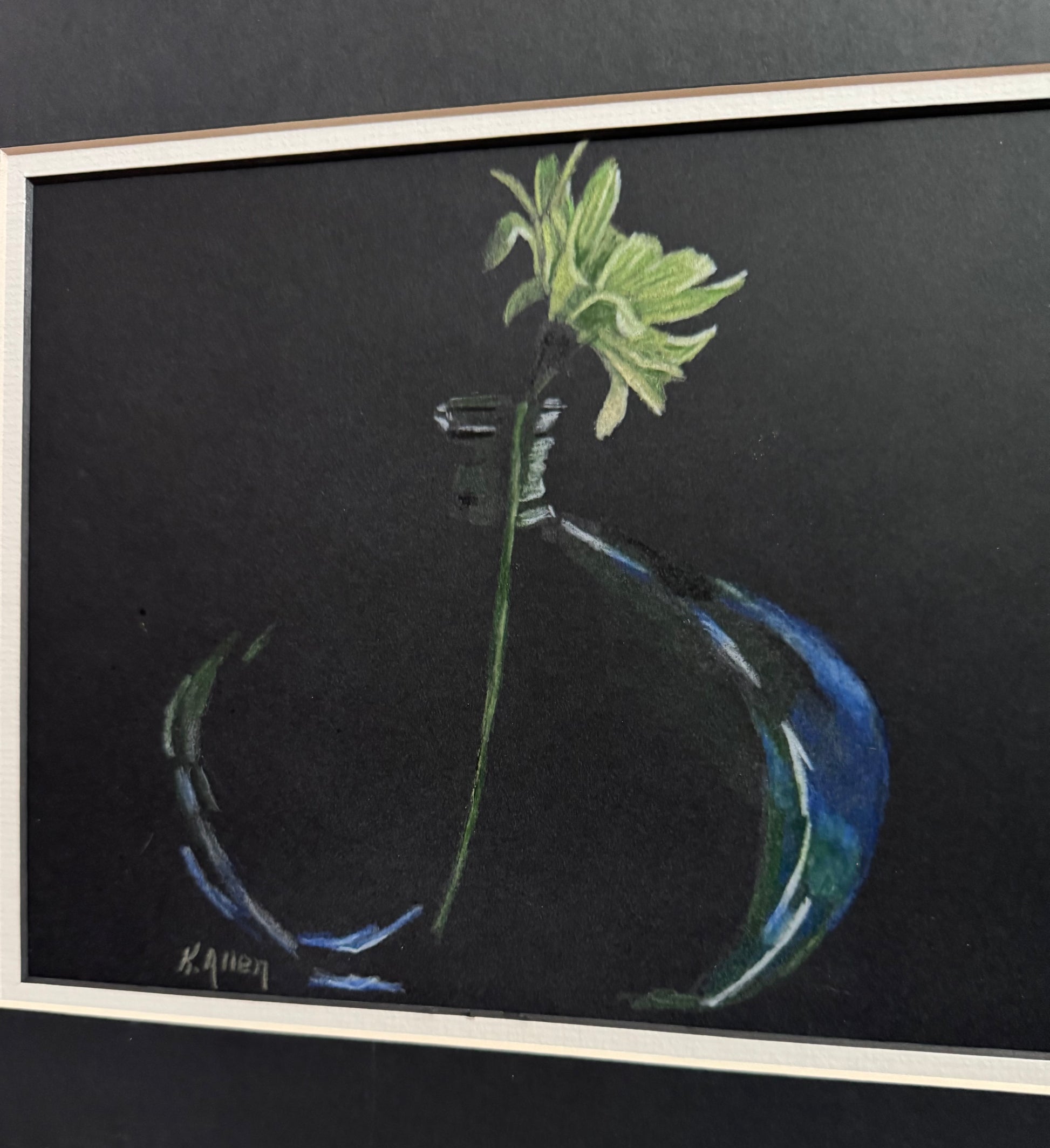 Original drawing showing simple form of a vase with flowers. 8 x 10 professional color pencil drawing, black matted to 11 x 14.